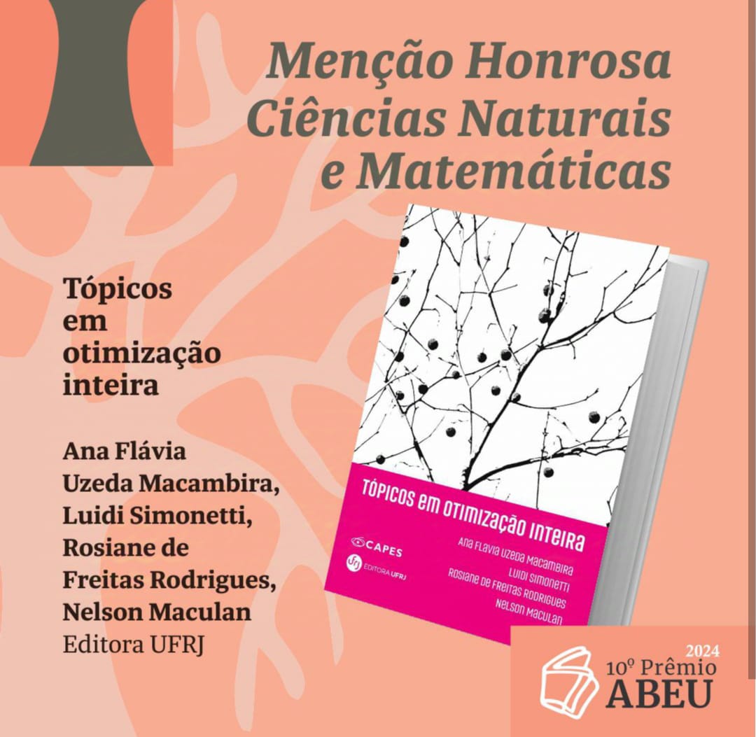 O livro "Tópicos em Otimização Inteira" de Ana Flávia Uzeda Macambira, Luidi Simoneti, Rosiane de Freitas Rodrigues e Nelson Maculan ganhou Menção Honrosa no Prêmio ABEU 2024.