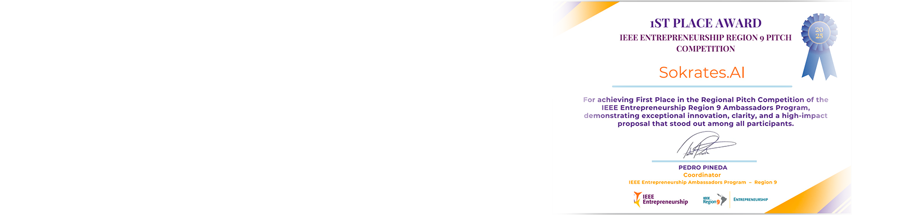 A Sokrates.AI, plataforma de mentoria socrática liderada pelo Prof. Geraldo Xexéo (PESC), e desenvolvida pelo LINE - laboratório de Tratamento de Informação Não-Estruturada - do PESC/COPPE/UFRJ, em parceria com a InoveLab – Ateliê de Inovação, um GT de PD&I da RNP, acaba de ser eleita a Melhor Proposta para América Latina no IEEE Region 9 Entrepreneurship Ambassadors Program 2025, do Institute of Electrical and Electronics Engineers (IEEE).