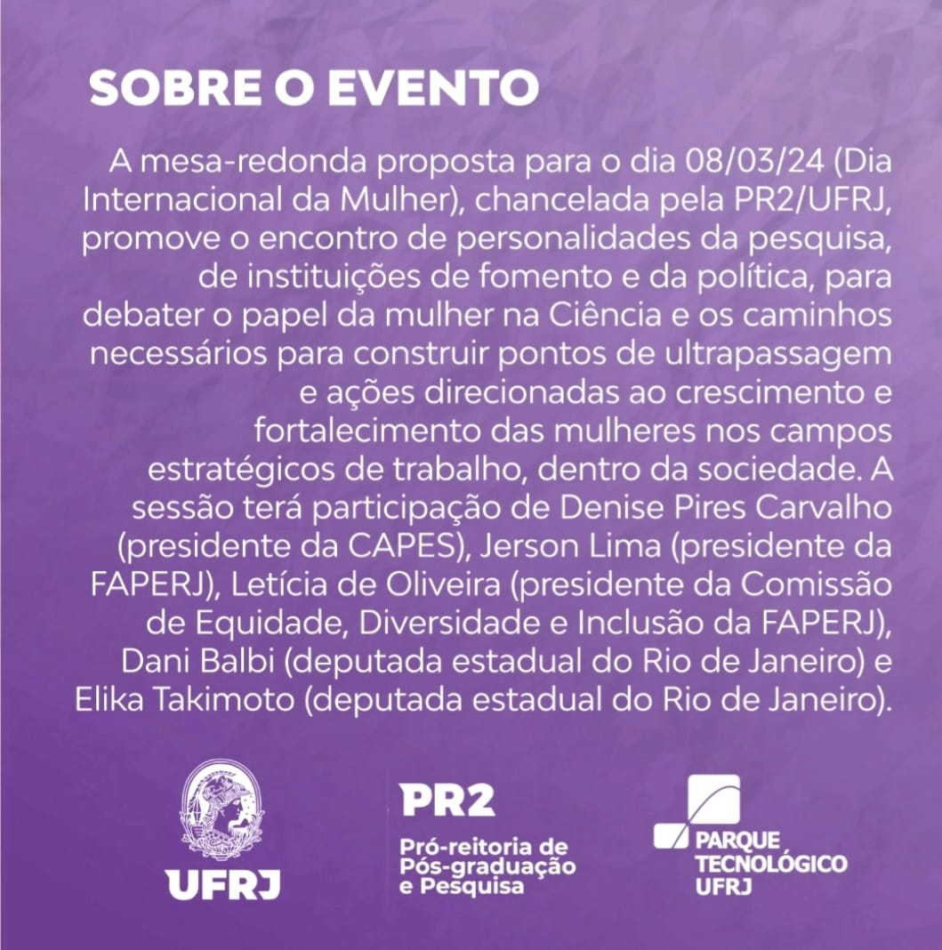No Dia Internacional da Mulher - 08/03/2024 - a Pró-Reitoria de Ensino para Graduados da UFRJ (PR2/UFRJ) promove uma mesa redonda com o tema "Mulheres e Ciência".