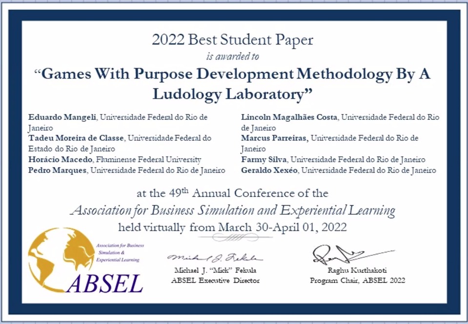 LUDES ganhou o prêmio “Best Student Paper” da conferência ABSEL-2022 com o artigo “Games with a Purpose Develpment Methodology By a Ludology Laboratory”, escrito por Eduardo Mangeli (M.Sc. e Doutorando/PESC), Tadeu Moreira de Classe (D.Sc. e Professor/UniRio), Horácio Macedo (BCC-UFRJ/Mestrando UFF), Pedro Marques (Graduando UFRJ), Lincoln Magalhães da Costa (ES-UFPR/Doutorando PESC), Marcus Parreiras (Mestre-CEFET/Doutorando PESC) e Farmy Silva (Mestre/Doutorando PESC) e Geraldo Xexéo (Professor do PESC). Veja clicando aqui.