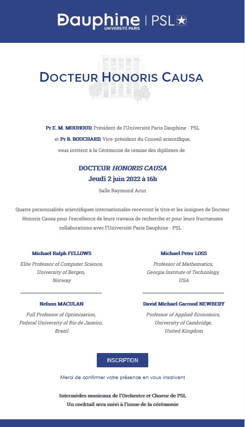 Outros três professores - Michael Ralph FELLOWS, da University of Bergen; Michael Peter LOSS, do Georgia Institute of Technology; e David Michael Garrod NEWBERRY da University of Cambridge) - também receberão o Docteur Honoris Causa em cerimônia a ser realizada no dia 2 de junho de 2022, às 16 horas, na Salle Raymond Aron, na Université Paris Dauphine - PSL. Após a cerimônia haverá uma apresentação da Orchestra et Choeur de PSL e será servido um coquetel.