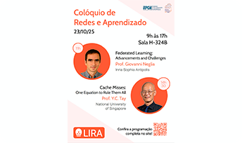Estaremos recebendo os professores Giovanni Neglia (INRIA, França) e Y. C. Tay (National University of Singapore). Ambos são pesquisadores de grande destaque e excelentes palestrantes. Eles vão proferir as seguintes palestras (dia 23/10, quinta-feira):