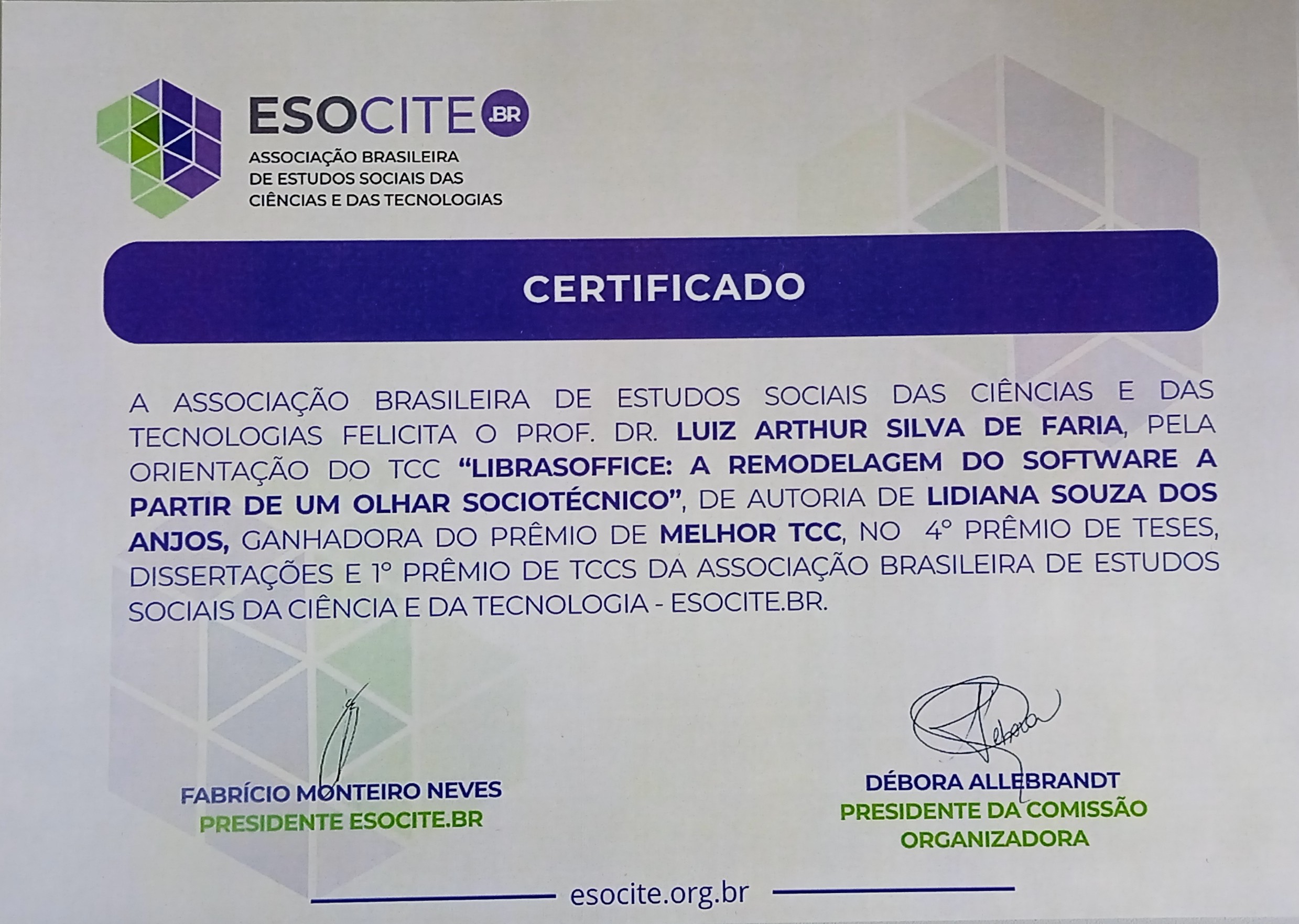 O trabalho de conclusão de curso intitulado "Repensando o LIBRASOffice: a remodelagem do software a partir de um olhar sociotécnico” foi contemplado com o Prêmio ESOCITE.BR de melhor TCC no 4º Concurso de TCCs, Teses e Dissertações da Associação Brasileira de Estudos Sociais das Ciências e das Tecnologias. O TCC foi desenvolvido pela estudante Lidiana Souza dos Anjos (ECI/POLI/UFRJ), sob orientação do professor Luiz Arthur Silva de Faria (PESC), e retrata etapas do projeto extensionista LIBRASOffice. O projeto foi desenvolvido por estudantes de graduação e de pós-graduação no Laboratório de Informática e Sociedade (LabIS), do PESC/COPPE/UFRJ, sob coordenação do professor Henrique Luiz Cukierman.