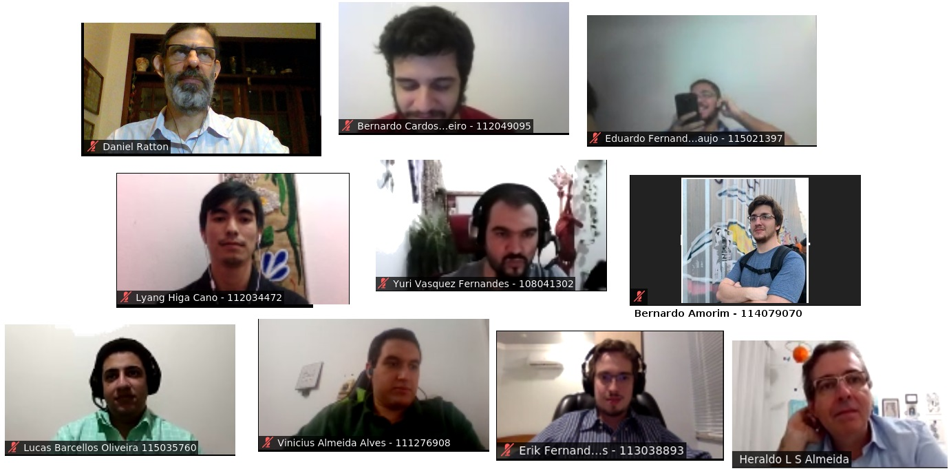 Abaixo foto durante participação remota (da esquerda para a direita, de cima para baixo): Daniel Ratton Figueiredo (Paraninfo), Bernardo Cardoso Cordeiro, Eduardo Fernando dos Santos Araujo, Lyang Higa Cano, Yuri Vasquez Fernandes, Bernardo Dornellas Cysneiros Gomes de Amorim, Lucas Barcellos Oliveira, Vinicius Almeida Alves, Erik Fernandes Tronkos, Heraldo Luís Silveira de Almeida (Prof. Homenageado).