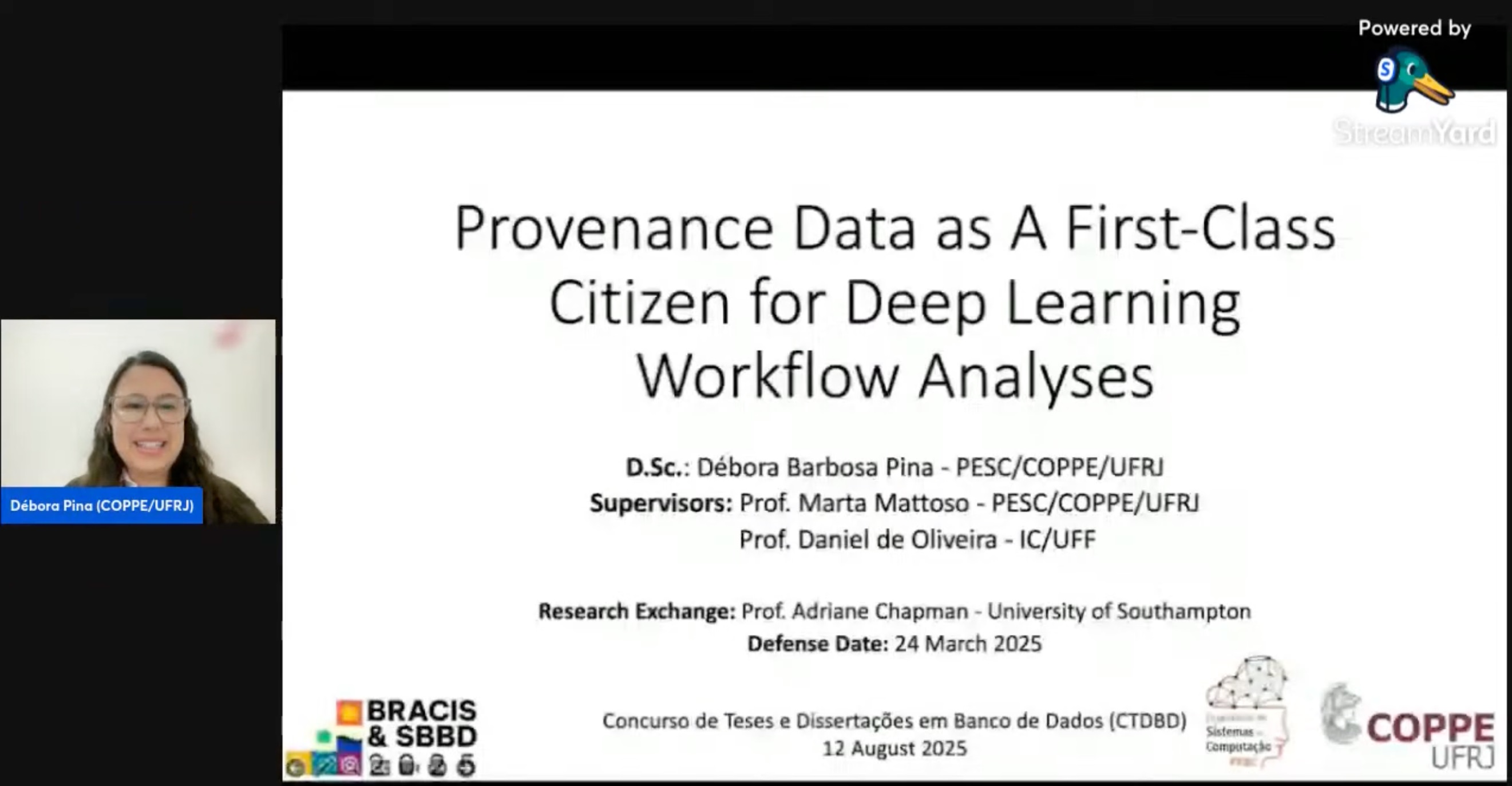 A tese de doutorado de Débora Barbosa Pina (PESC) "Provenance Data as a First-Class Citizen for Deep Learning Workflow Analyses", orientada por Marta Mattoso (PESC) e Daniel de Oliveira (IC, UFF), defendida em 24/03/2025, recebeu o prêmio de Menção Honrosa, como uma das três melhores teses na 7ª edição do Concurso de Teses e Dissertações do XL Simpósio Brasileiro de Bancos de Dados (SBBD 2025) clique aqui para mais detalhes.