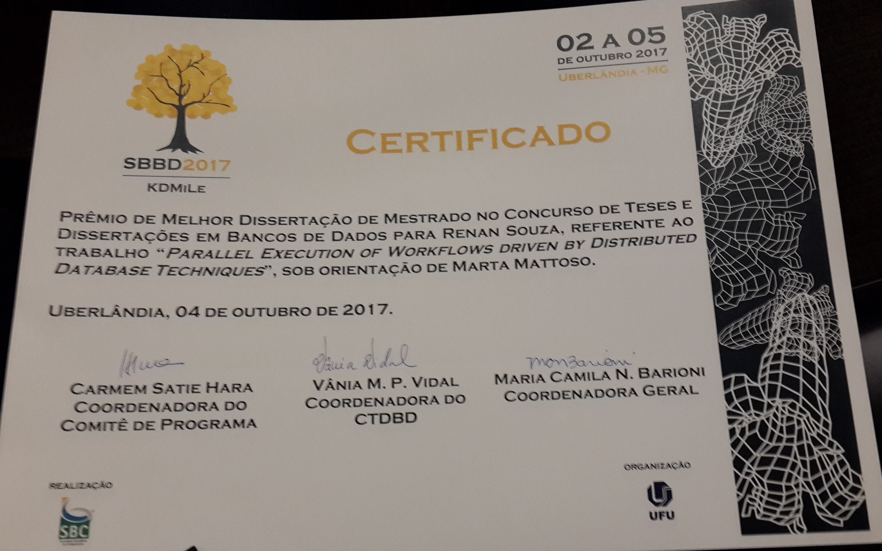Renan, atualmente realizando seu Doutorado no PESC, foi premiado com sua dissertação de Mestrado "Controlling the Parallel Execution of Workflows Relying on a Distributed Database" orientada pela professora Marta Mattoso do PESC.