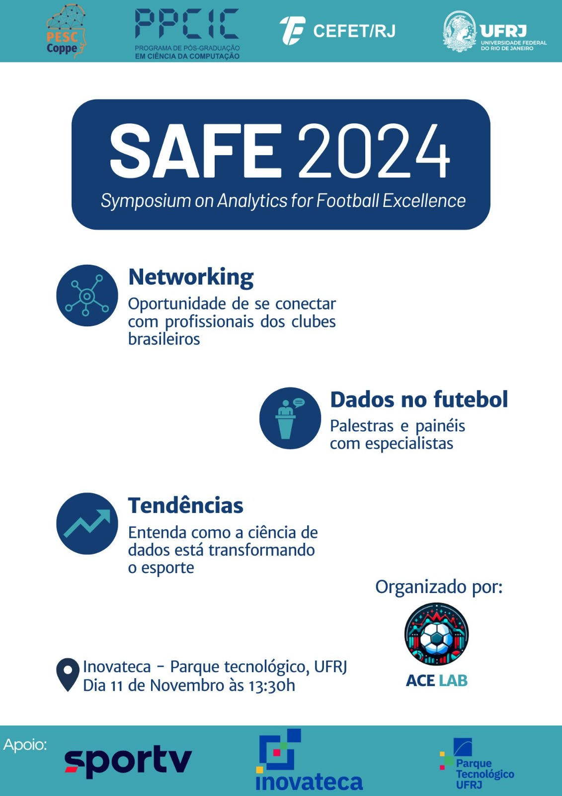 O SAFE 2024 acontecerá no dia 11 de novembro de 2024, na Inovateca, no Parque Tecnológico da UFRJ - Ilha do Fundão, das 13:30 às 16:45. O evento contará com palestras, apresentações de casos de sucesso e discussões sobre ciência de dados aplicada ao futebol.