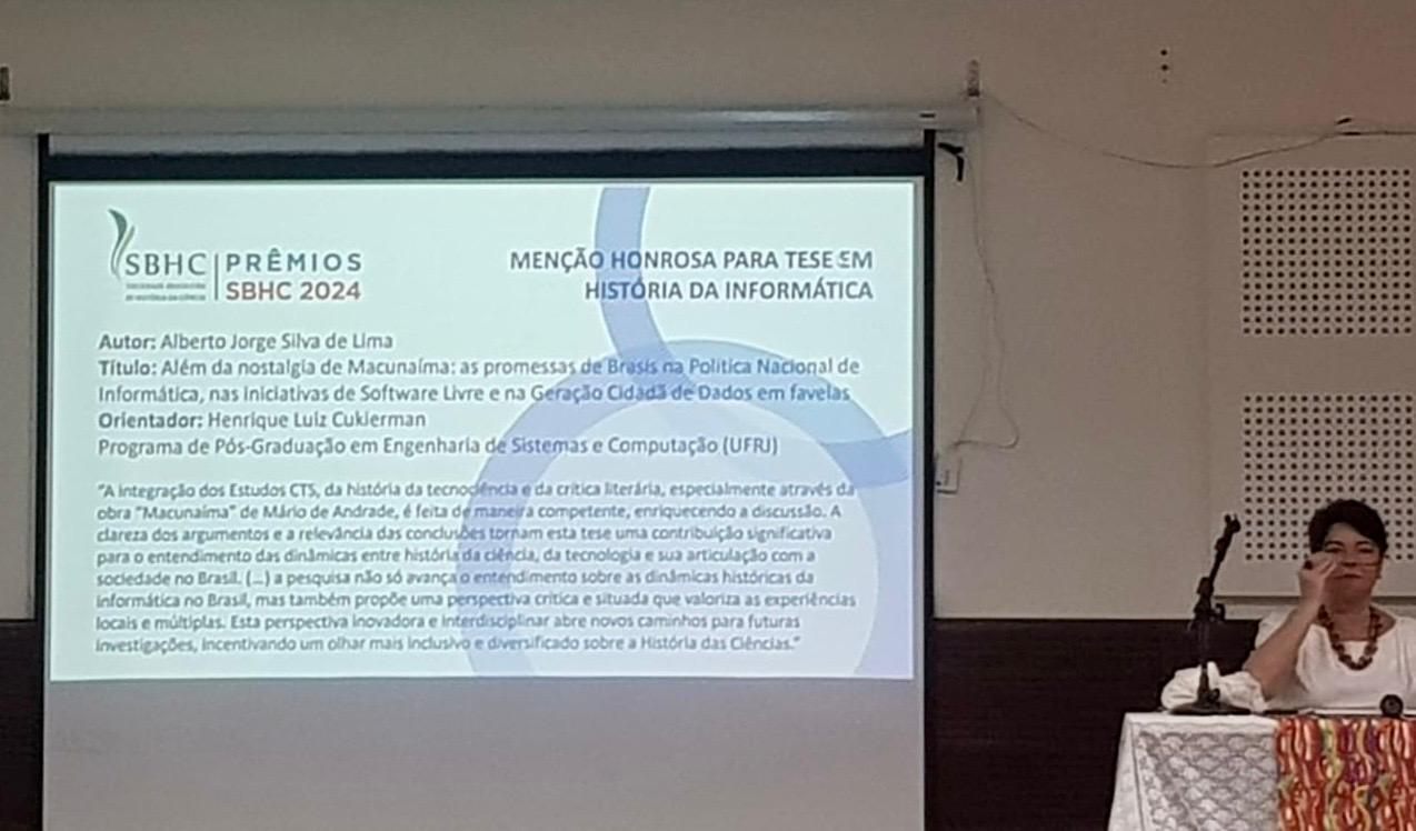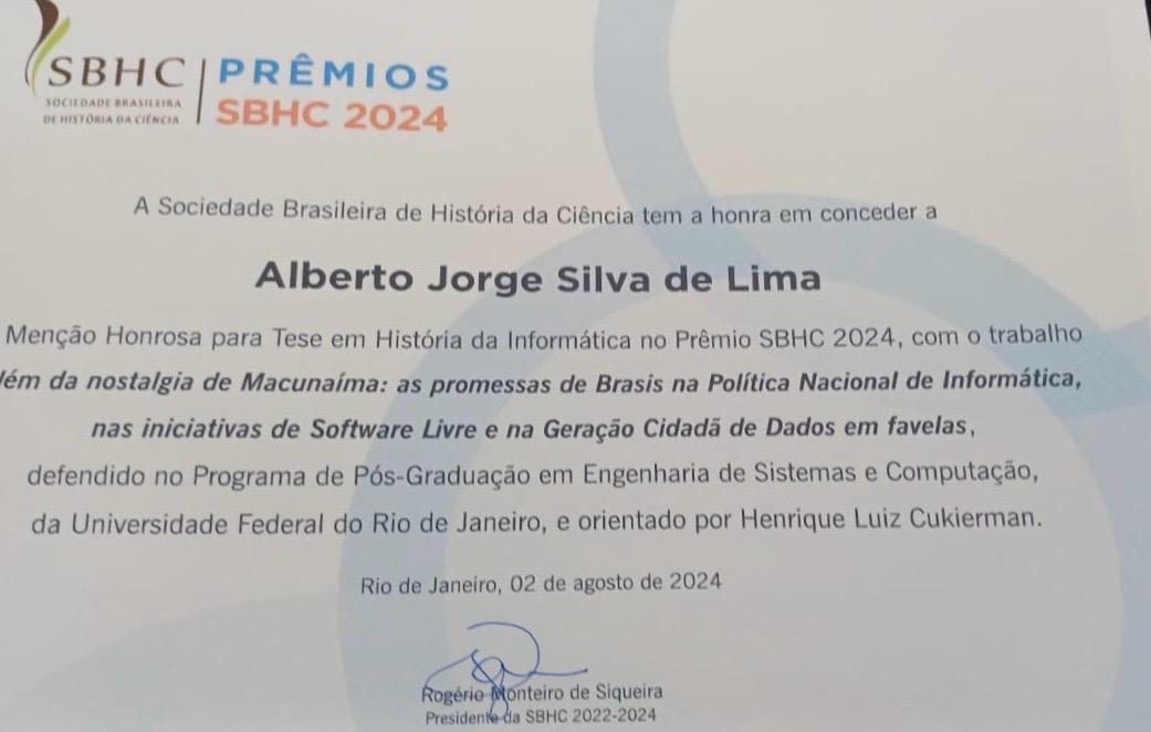 A tese de doutorado “Além da nostalgia de Macunaíma: as promessas de Brasis na Política Nacional de Informática, nas iniciativas de software livre e na geração cidadã de dados em favelas”, de autoria de Alberto Jorge Silva de Lima, defendida no PESC/COPPE/UFRJ em 2022 e orientada pelo Prof. Henrique Luiz Cukierman, da área de pesquisa em Informática e Sociedade, recebeu a Menção Honrosa para Tese em História da Informática na edição de 2024 do Prêmio de Melhor Tese de Doutorado em História das Ciências da Sociedade Brasileira de História da Ciência (SBHC).